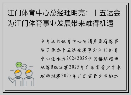 本文围绕“青训姚明:培养未来篮球明星的梦想与使命”这一主题进行深入探讨。文章首先概述了姚明在中国篮球青训领域的重要性和影响力,强调他如何通过个人经历和社会责任感来推动年轻球员的发展。接着,从四个方面详细分析了姚明对青训的贡献,包括理念传承、系统建设、国际视野和社会责任。这些方面不仅展示了姚明作为一名运动员的成就,更突显了他在培养下一代篮球人才方面所肩负的使命与愿景。最后,文章总结了姚明的努力对中国...